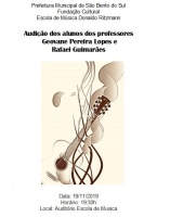 Audição dos alunos de violão dos professores Geovane Pereira Lopes e Rafael Guimarães Data: 19/11/2019 Horário: 19:30hLocal: Auditório Escola de Musica Entrada Gratuita!