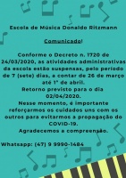 Conforme o Decreto n. 1720 de 24/03/2020, as atividades administrativas da escola estão suspensas, pelo período de 7 (sete) dias, a contar de 26 de março até 1º de abril.
